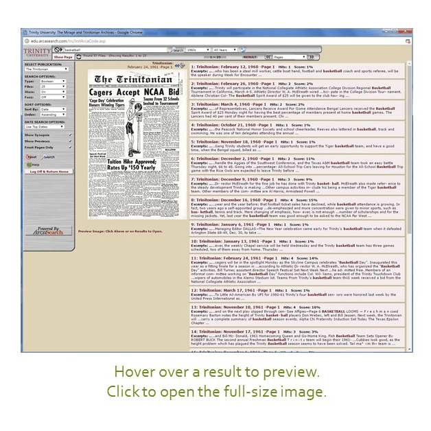 Searches can be limited to the Trinitonian, Mirage, or Course of Study Bulletins, or you can search all three at the same time. Searches can also be limited to specific date ranges, or you can browse specific issues of each publication using the date drop down menu. For more searching tips, including a refresher on Boolean searches, click the green “Help” button on the left-hand menu.