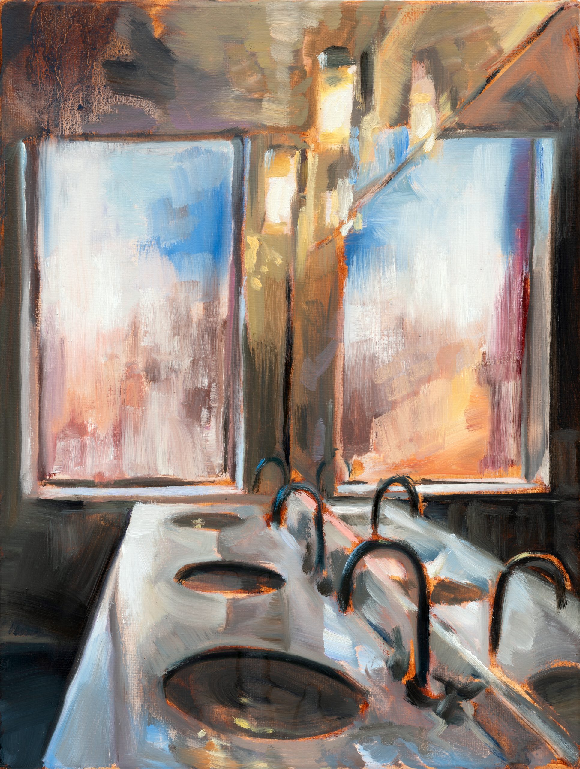 Title: Mabee MirrorArtist: Ruby WalkerDate: 2023Genre/Form: oil on canvasLocation: 2nd Floor – Coates Library, Trinity University Title: Dormitory Sunrise Title: Bus Stop Daybreak in Austin Title: Access Ramp